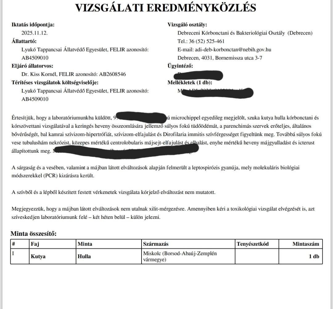 Kértünk toxikológiai vizsgálatot a szövettani mintákból, és már dolgoznak is rajta a szakértők. Folyamatos kapcsolatban vannak az orvosunkkal — ezért végtelenül hálásak vagyunk.